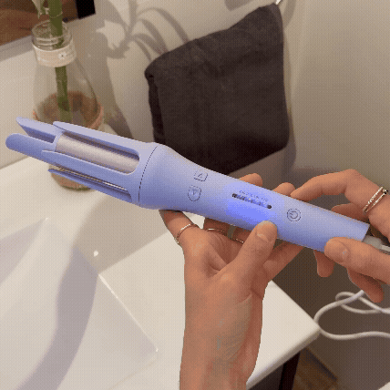 Encendemos el rizador manteniendo pulsado el boton de encendido, presionamos el boton hasta alcanzar la temperatura que buscamos.